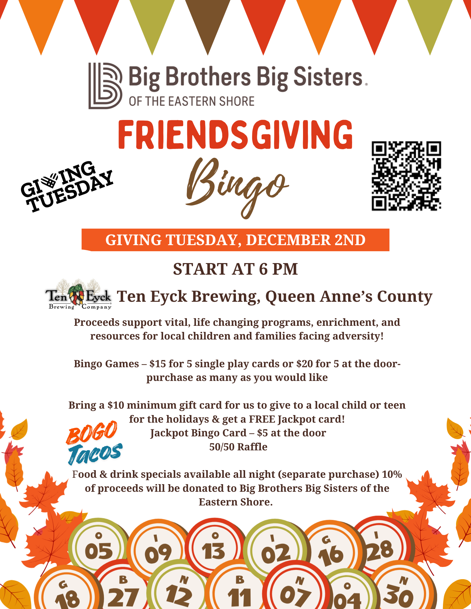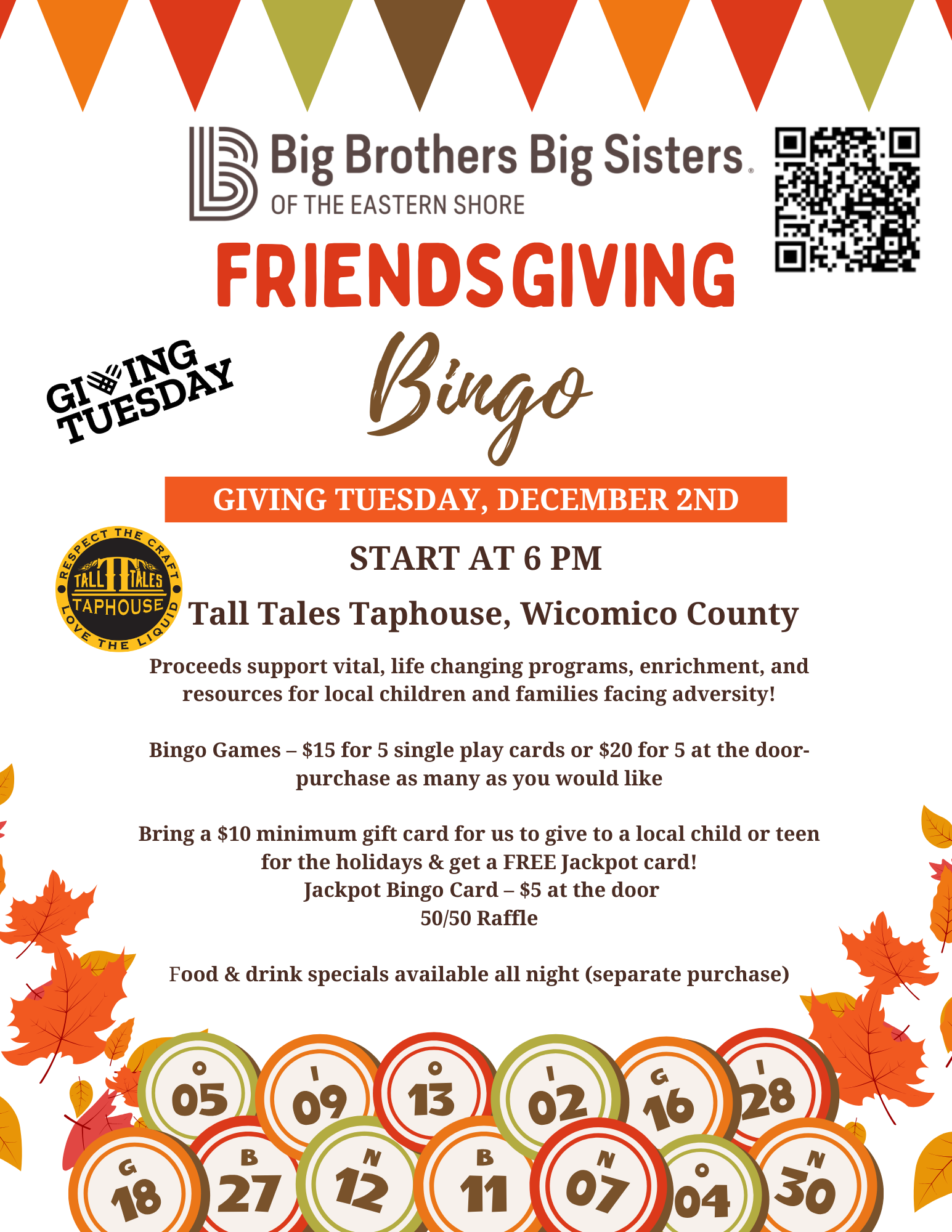 This Giving Tuesday (Dec 2nd), Big Brothers Big Sisters of the Eastern Shore will be hosting events throughout Maryland’s Eastern Shore. From Bingo to a Friendsgiving Celebration, we have lots of fun planned for Giving Tuesday. Be sure to check back leading up to December 2nd for additional events in your area. If you are a business owner or partner who is interested in sponsoring one of our events or an event in your area, please reach out to our Events Team at connect@shorebiglittle.org. We look forward to seeing you on Friendsgiving Tuesday!